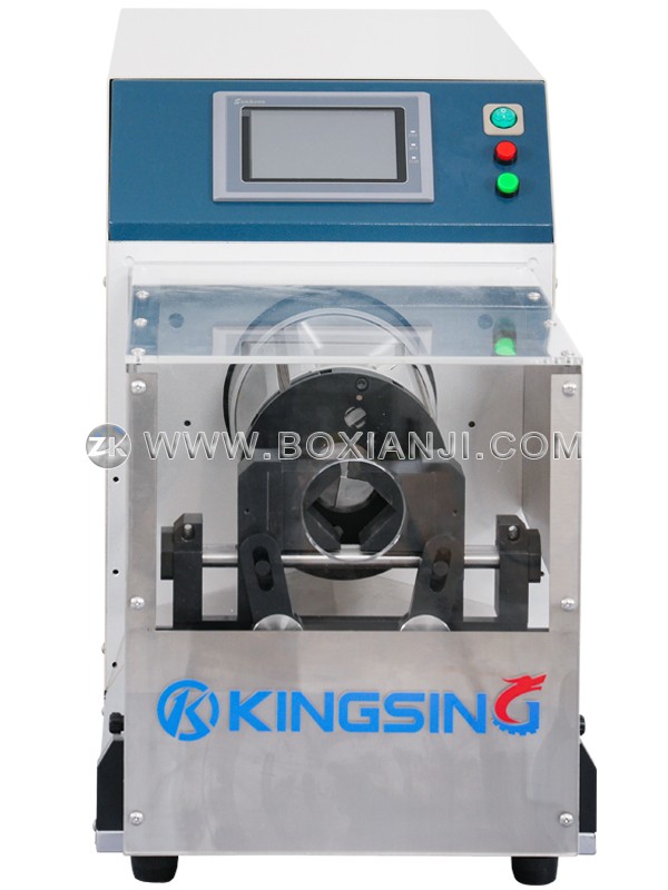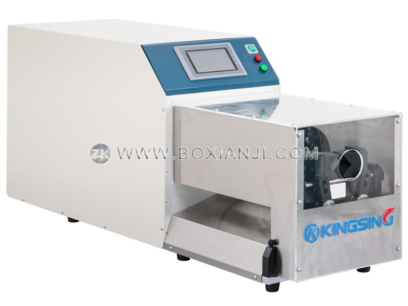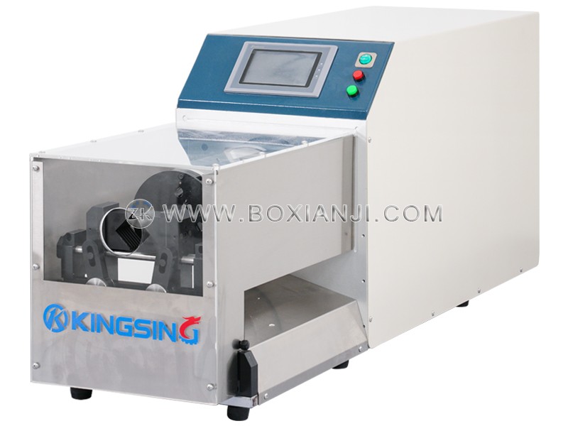 这是一款新能源大平方旋转刀剥线机,适用于加工各种同轴电缆、新能源高压电缆、汽车电缆、医疗电缆、高温线等。它采用4片高精密钨钢刀旋转剥皮,最大剥皮外径可达44mm,最大剥皮长度可达200mm。旋转刀可将剥皮位置360度环切,剥口平整光滑,剥皮长度精准,进刀精度可达0.01mm,不伤内层。