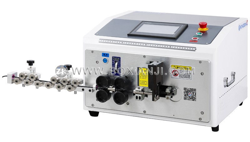 这是一款全自动裁线剥皮折弯机,专为加工BV硬线而设计,最大可加工16mm2线材。本机采用4个送线轮送线,增大了送线轮与线材的接触面积,可以防止线材在送线轮间打滑,并提供强劲的剥皮动力。
